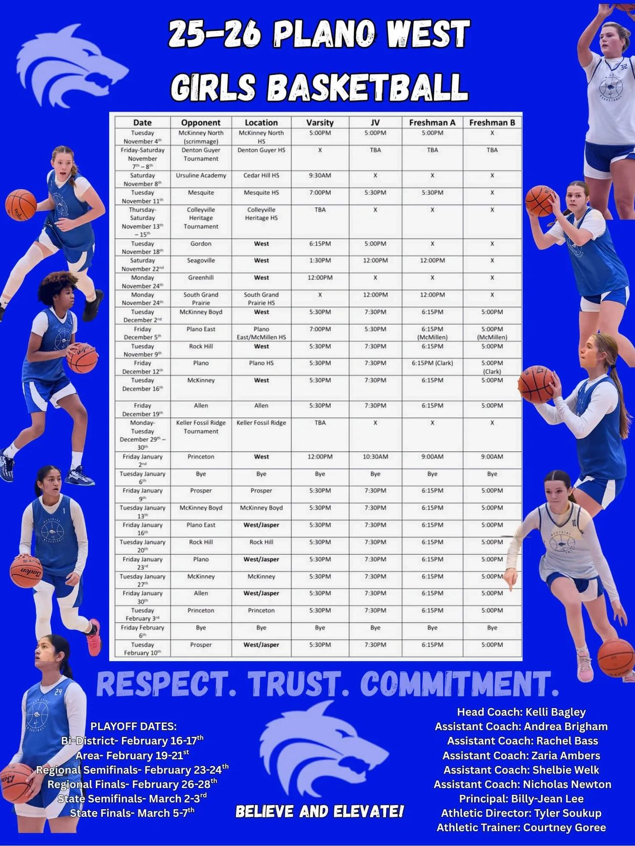 Welcome to Plano West Girl's Basketball High School Sports Team website. We are a group of passionate girls who love playing basketball. We practice regularly and participate in various tournaments and events throughout the year. Our team is open to high school girls of all skills levels who share the same enthusiasm for basketball. Join us today and let's have fun while staying active!